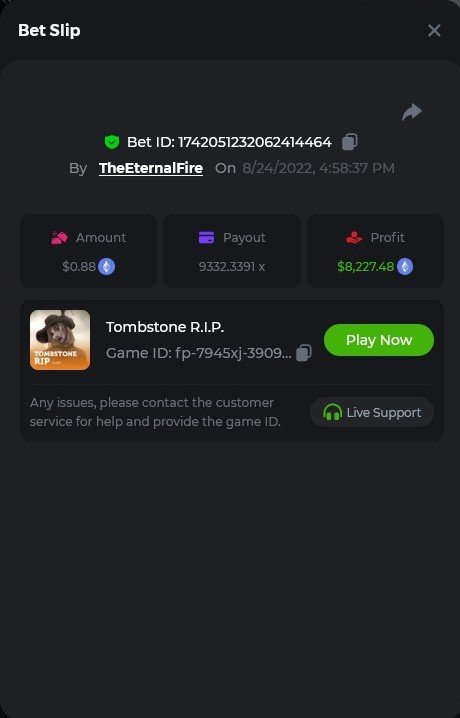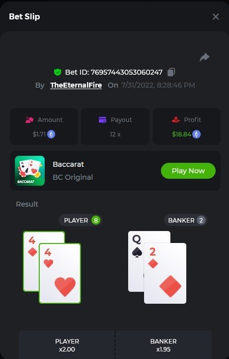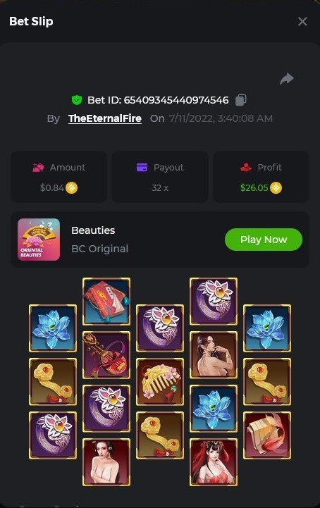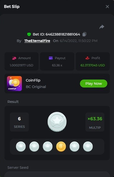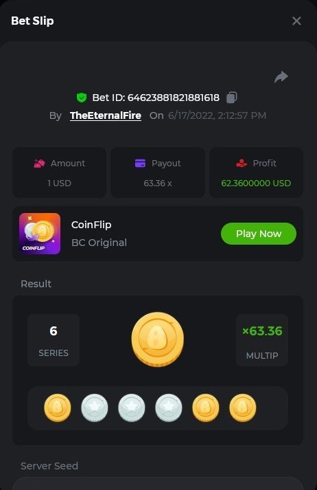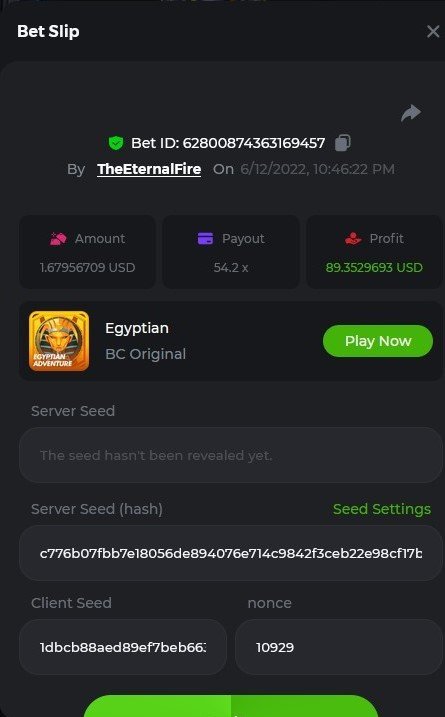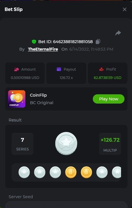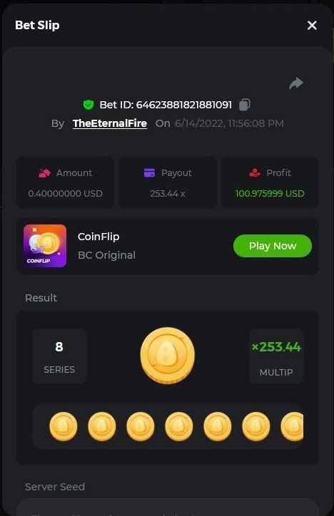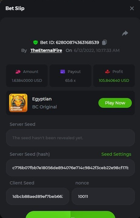 1. X83: Bet ID: 129193616991060246 https://bc.game/#/sd/116KJZBU600TUB ----- X130: Bet ID: 129444142433436075 https://bc.game/#/sd/116NAN0FM7WIS3 ---- X58: BET ID: 129619304084669553 https://bc.game/#/sd/116P9N5XJH32TV ---- X420 Bet ID: 129619304084671976 https://bc.game/#/sd/116PHFI0T492QB
