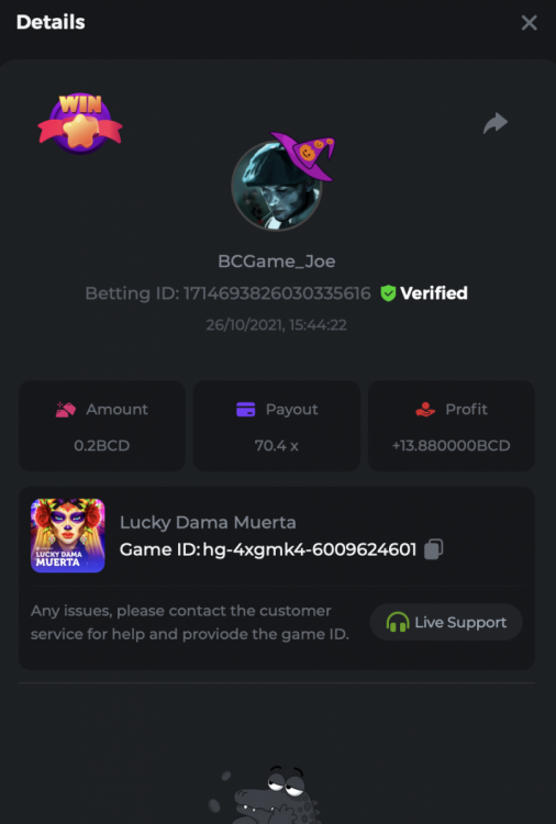 7. HALLOWEEN SLOT BATTLE Starts: 26, October 14:00 GMT Ends: 2, November 14:00 GMT Welcome back, to celebrate this Halloween season we have a spook-filled BGaming Halloween slot battle for you this week, with a total prize pool of $4,000! What's the Challenge? BGaming Multiplier battle - Get the highest multiplier on any of the 4 BGaming slots below Lucky Dama Muerta Spin & Spell Candy Monsta Fruit Million - Halloween Edition 1 prize per slot, awarded to the person with the highest multiplier on each of the 4 games above Each winner must be unique - meaning 4 prizes given to 4 separate people - you cannot win more than one prize! In the event that someone does post winning entries for more than 1 slot, the entry with the highest multiplier will be valid - all other entries will be disregarded and the prize will be awarded to the next valid entry. Minimum VIP Tier Must be VIP4 or higher in order to enter this challenge. Minimum Bet Size Lucky Dama Muerta - $0.20 Spin & Spell - $0.20 Candy Monsta - $0.20 Fruit Million - Halloween Edition - $0.20 Eligible Coins All coins are eligible (excluding JB) Available Prizes Lucky Dama Muerta - Highest Multi......$1,000 Spin & Spell - Highest Multi.....$1,000 Candy Monsta - Highest Multi....$1,000 Fruit Million - Highest Multi......$1,000 How to Enter To enter, copy the bet ID of the bet you'd like to submit Once you've copied it, post it as a reply to this thread like so: Betting ID: 1708854428417660423 In the same post, upload a screenshot of your win by clicking the game ID WITH VIEW IN USD mode ENABLED (accessible at the bottom of dropdown menu for your wallet up top. This way, we can ensure that your bet indeed met the minimum requirement at the time of placing it: