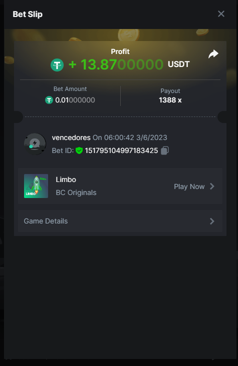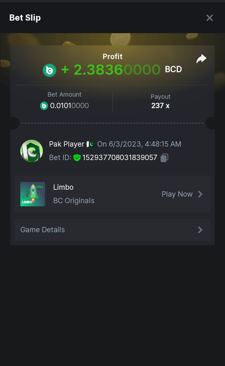 Maksypro Posted June 2, 2023 Share Posted June 2, 2023 Read Carefully Before Start To Hunt Daily Challenges #254 LIMBO Hunt : Win the highest multiplier Min Multiplier requirement 100x Min Level 4 ๏ธDuration Starting : Now End time : 23.59 UTC Time How to Join? Make screenshot + paste your bet link + UID or Profile link Any coin, with min bet 0.01 USD is allowed (jb/bb/bcl not allowed) Reward Prizes 1st Place.....$7 BCD 2nd Place.....$5 BCD 3rd Place.....$4 BCD 4th Place.....$3 BCD 5th Place.....$2 BCD ๐ต Winners will be announcing next day after Roll Point! 2 Link to comment Share on other sites More sharing options...