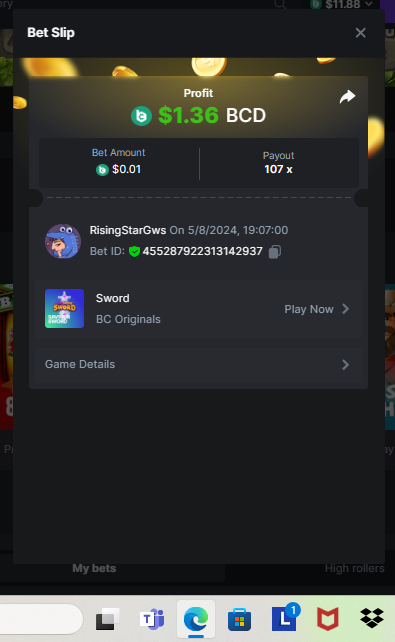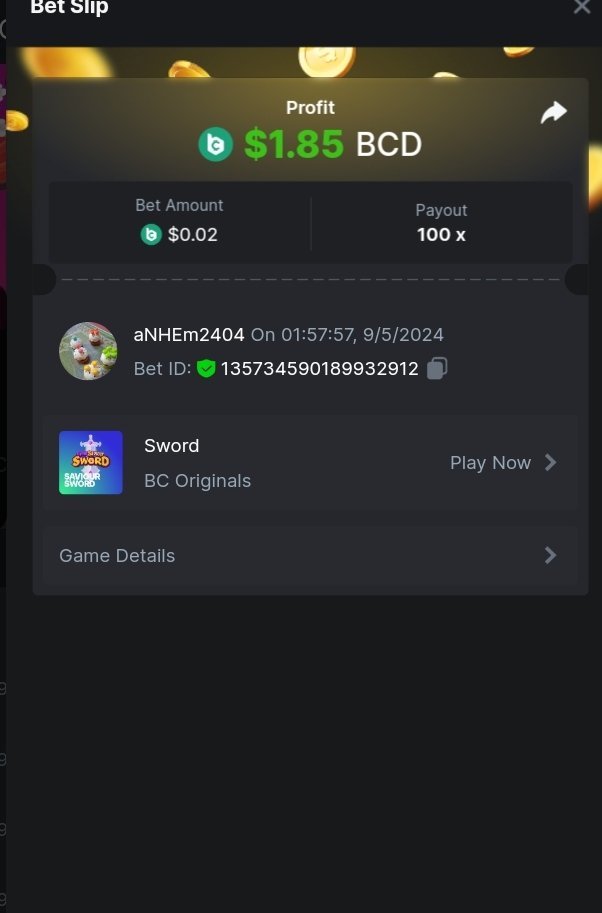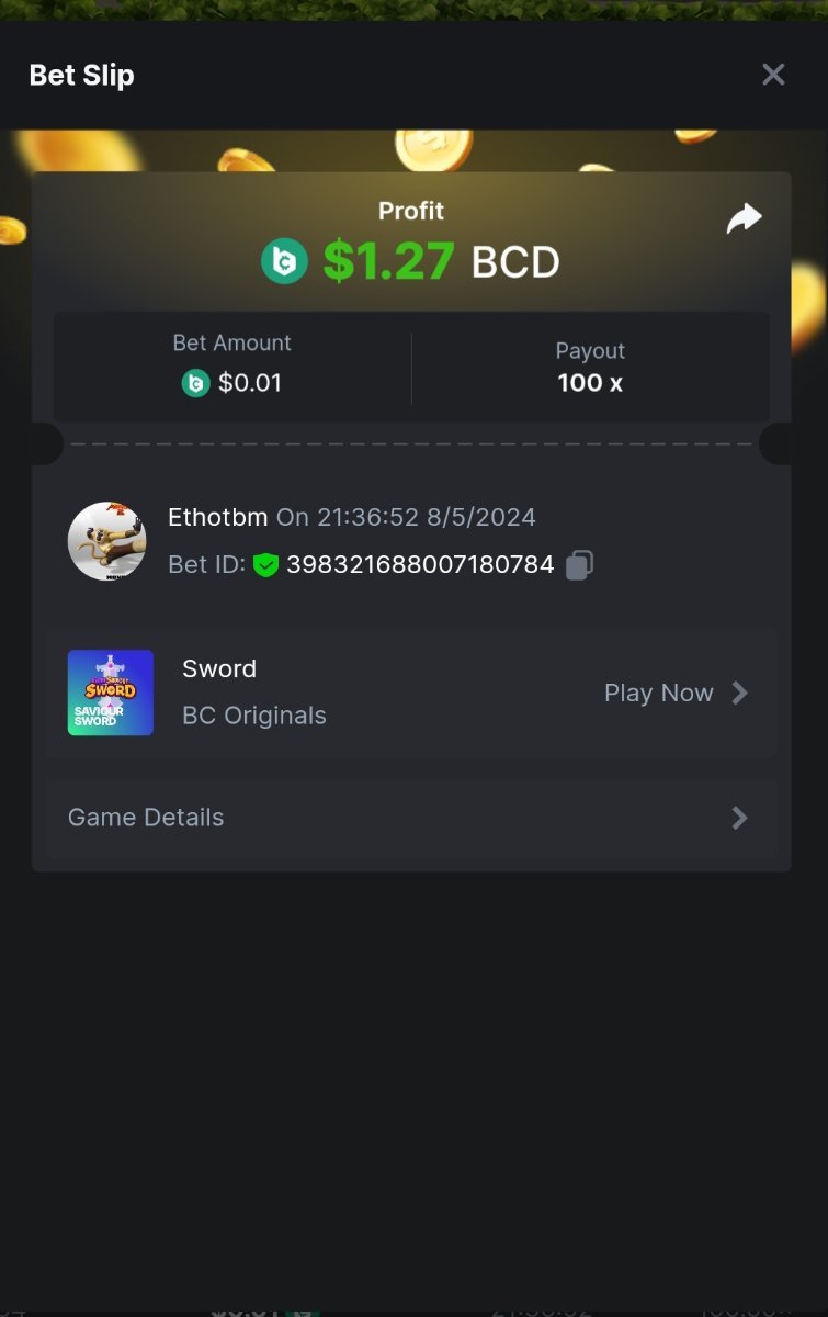 Moderator Giandreas Posted May 8, 2024 Moderator Share Posted May 8, 2024 Read Carefully Before Start To Hunt Forum Daily Challenges #594Hunt : Sword Win the highest pay out Min Payout : x20 Min Level 10️Duration Starting : Now End time : 23.59 UTC Time How to Join? Make screenshot + paste your bet link + UID or Profile link Any coin, with min bet 0.01 USD is allowed (jb/bb/bcl not allowed)Reward Prizes 1st Place.....$7 BCD 2nd Place.....$5 BCD 3rd Place.....$4 BCD 4th Place.....$3 BCD 5th Place.....$2 BCD 🏵 Winners will be announcing next day after Roll Point! 1 Link to comment Share on other sites More sharing options...