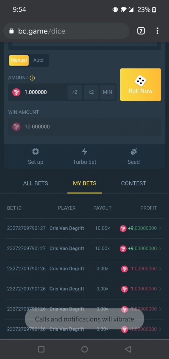 bet on Classic Dice using any coin worth 0.05 USD and hit 10x at least two times in a row
