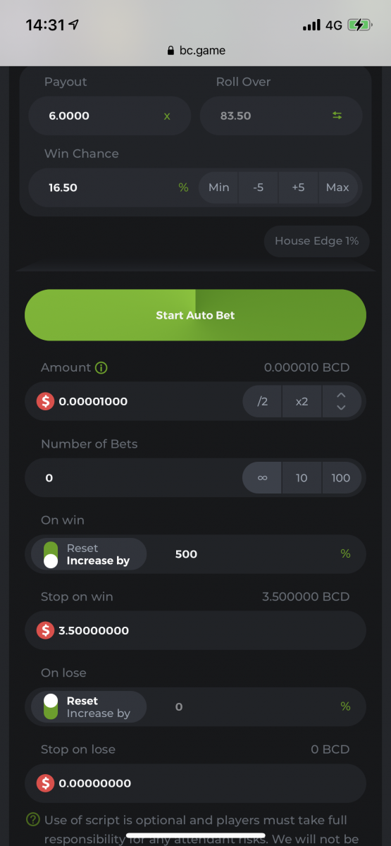 Kett Posted November 3, 2021 Share Posted November 3, 2021 Wanted to share few of the strategies I commonly use on dice bets. Ill consider uploading few more if you guys like my strategies. **WARNING** All of my strategies are very high volatile. Its important to Test out using minimum bet amount first. 1. Payout:6x On Win increase by 500% On lose Reset **Stop on profit bet amount x 35000 In this strategy we are aiming for 6 Wins in a row which will pay x77,000 of your original bet size. **always turn on stop on profit for this strategy otherwise it will not work!! 2. Payout: 10x On win Reset On lose increase by 20% to 50% this is one of my favourite strategy. From $10 to $500 in 10min in a good run I generally increase 50% on every lose. But if you think its too risky 20% will bring decent profit. Link to comment Share on other sites More sharing options...