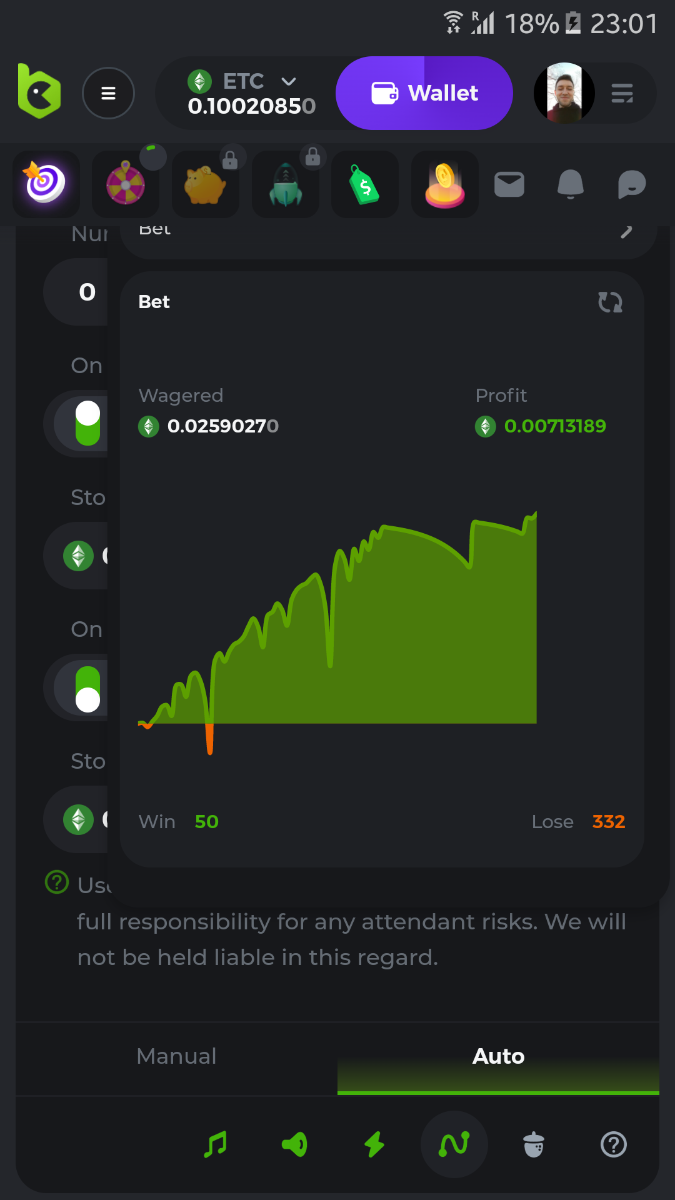 COCOIN Posted March 20, 2022 Share Posted March 20, 2022 12 hours ago, NotYourGuyBuddy said: First thing is I recommend that you have a decent starting bankroll. This strategy can be done off a small balance but there is substantially less room for error. Set payout to 4x Start min bet with increase on loss at 100% You can set it to stop on loss any amount but from my experience 9 times out of 10 the bet after it stops will be a winner Every 400-600 bets change seed as long as your starting balance is large enough or you keep a close eye on things and don't let it crash out you can literally keep your wager amount and profit amount the exact same. Basically wager $100 profit $100 Not only good profits but also fast tracking on leveling up as well. Good luck and many profits. good script Link to comment Share on other sites More sharing options...